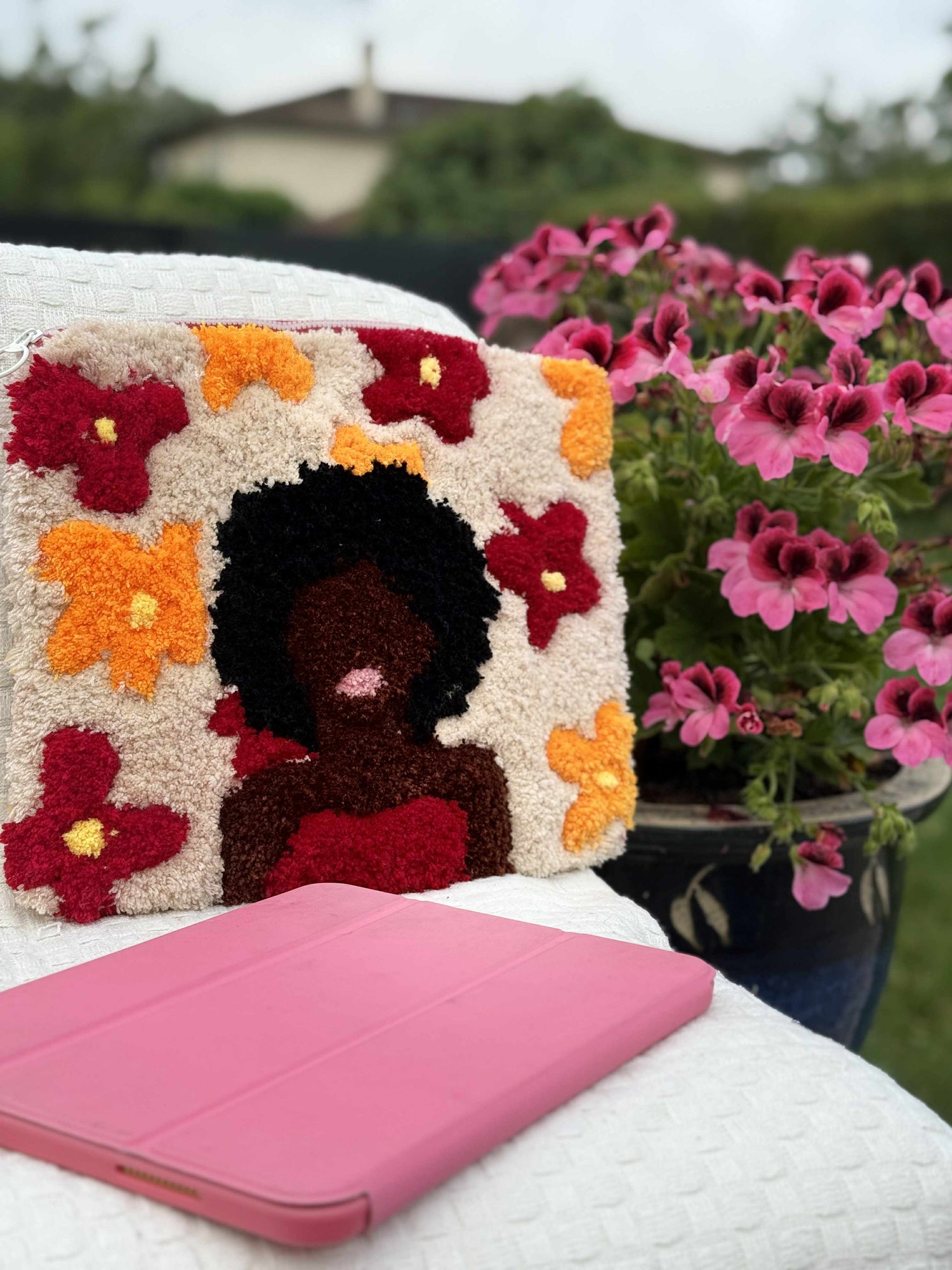 Réalisation d'une housse pour Ipad avec motif fleuris et d'une femme à la coupe afro
