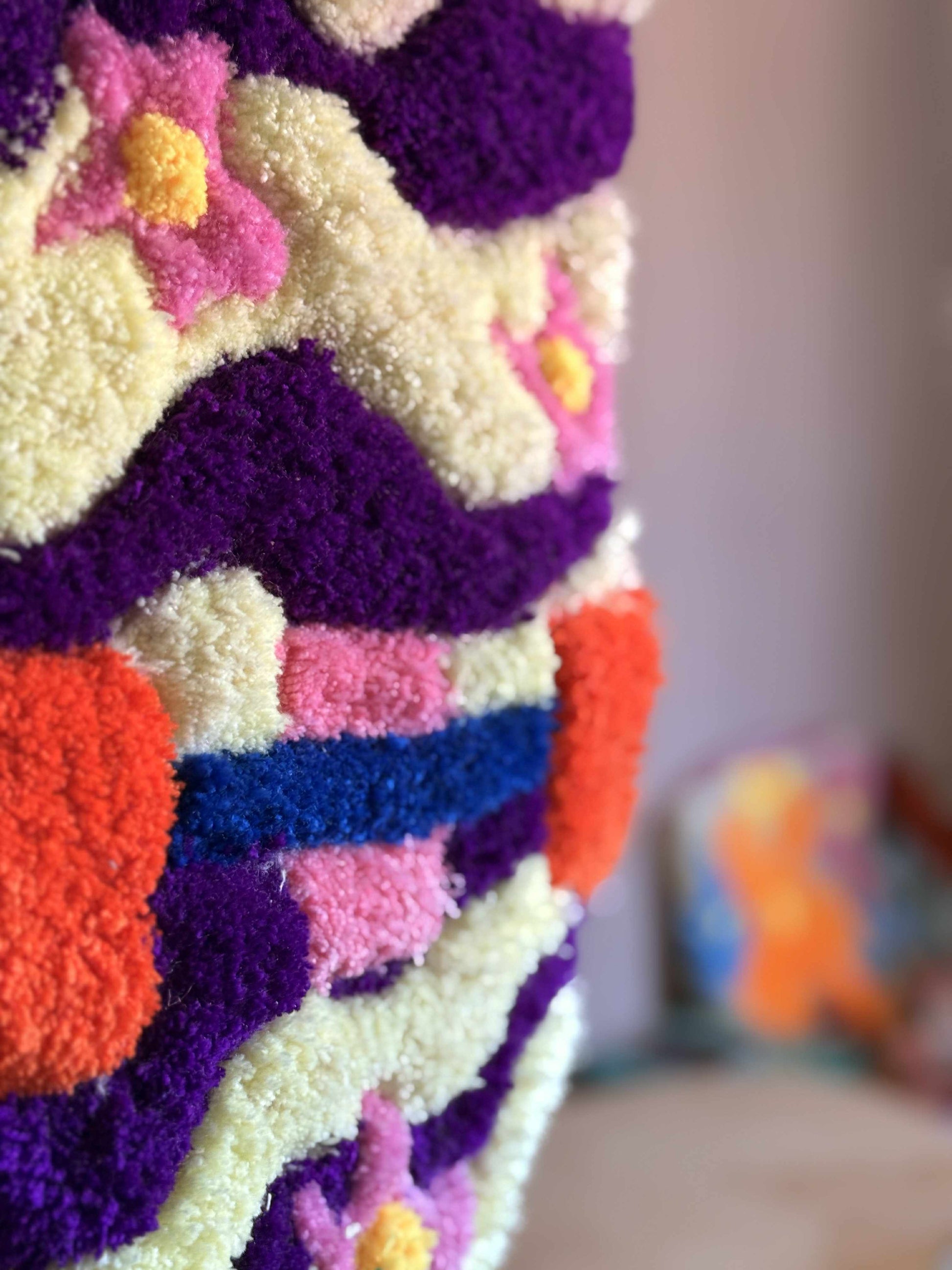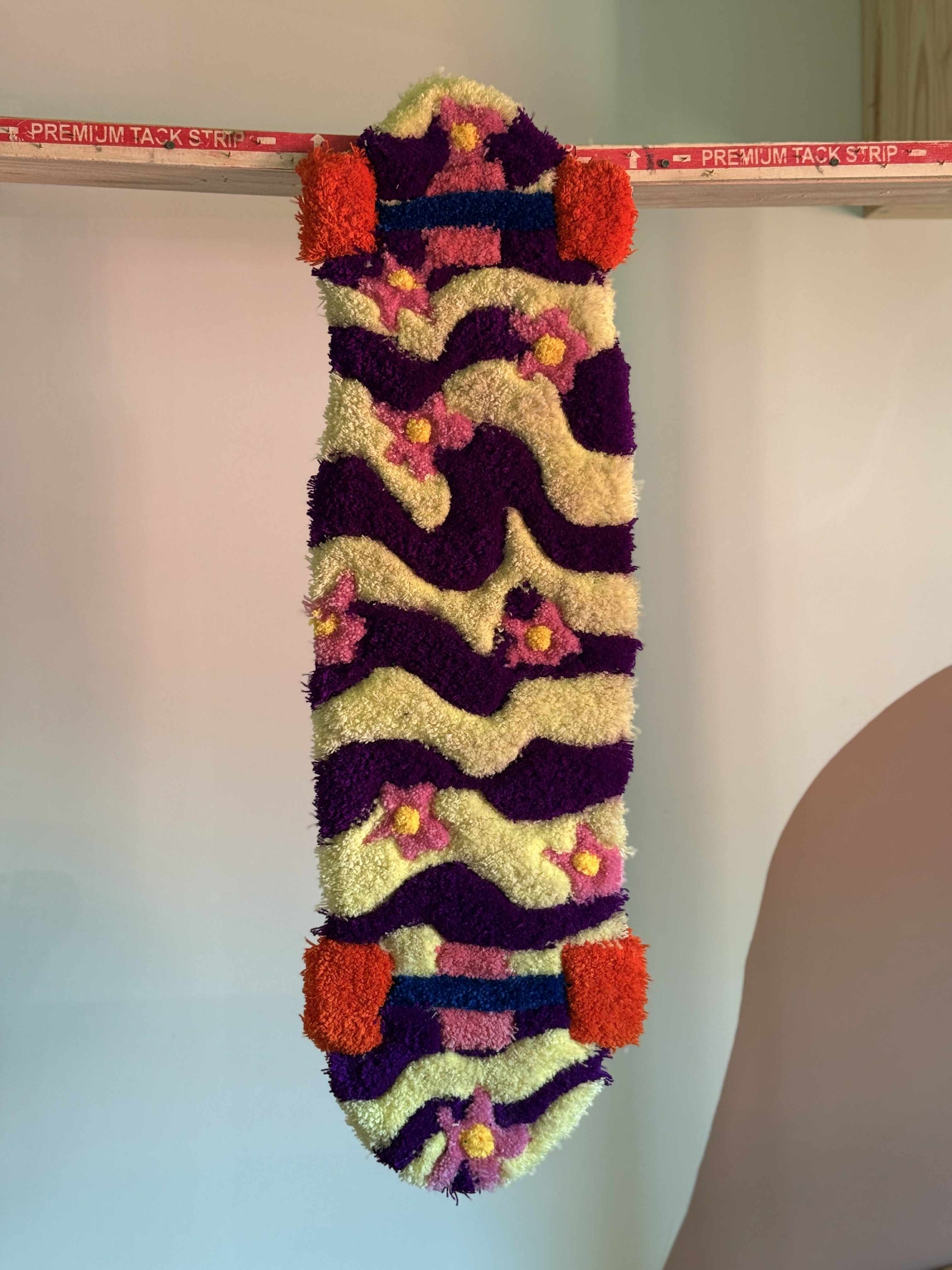 Apportez une touche fun et décalée à vos murs avec ce skateboard tufté aux motifs wavy et fleuris. Fait main, doux au toucher et plein de peps, il mêle esprit skateur et ambiance bohème pour une déco unique et originale.